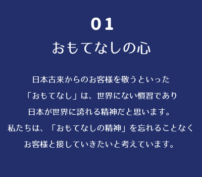 『おもてなしの心』をお客様にお届けすることで、 きっと。。。ご満足と感動を感じていただけると思います。