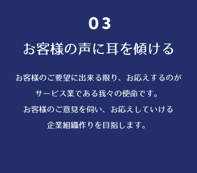 当社では、お客様の声に耳を傾けることによって、新サービスを考え実践してきました。 ムダを省いた適正価格や高クオリティのサービスのみならず、